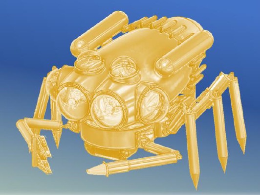 The full-size machine is meant to be big enough to carry two people on a multiple-day mission at depths up to about 20m. As designed it will weigh 7 tonnes. It will walk on six legs and use its remaining two to carry pincers or other tools.